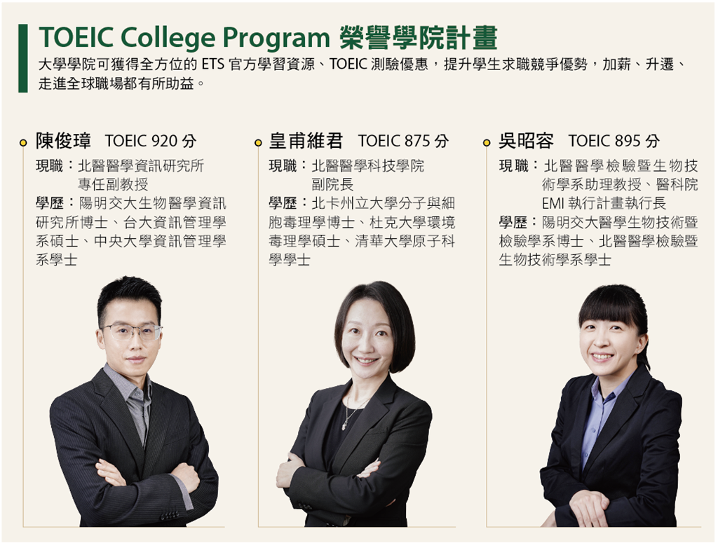 在全球化時代,英語不僅是國際溝通的橋梁,更是學術研究與專業發展不可或缺的基礎工具。特別是在醫學領域,英語能力的高低往往決定了專業知識的獲取效率、國際交流的順暢度,甚至影響未來職涯的發展方向。臺北醫學大學醫學科技學院於去(2024)年成為TOEIC榮譽學院成員,三位教授親自參加TOEIC測驗,皆考取860分以上並獲得榮譽學院限定TOEIC金色證書悠遊卡。